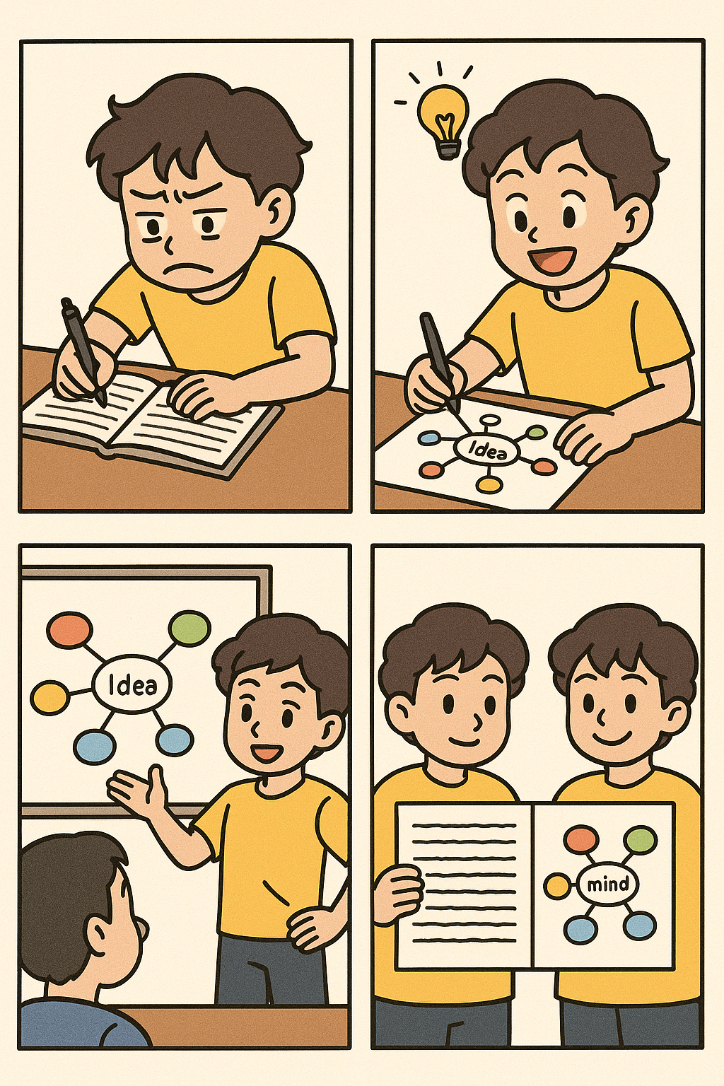 아이디어 정리, 복습, 창의적 사고가 필요한 순간에는 마인드맵이 훨씬 더 효과적임.